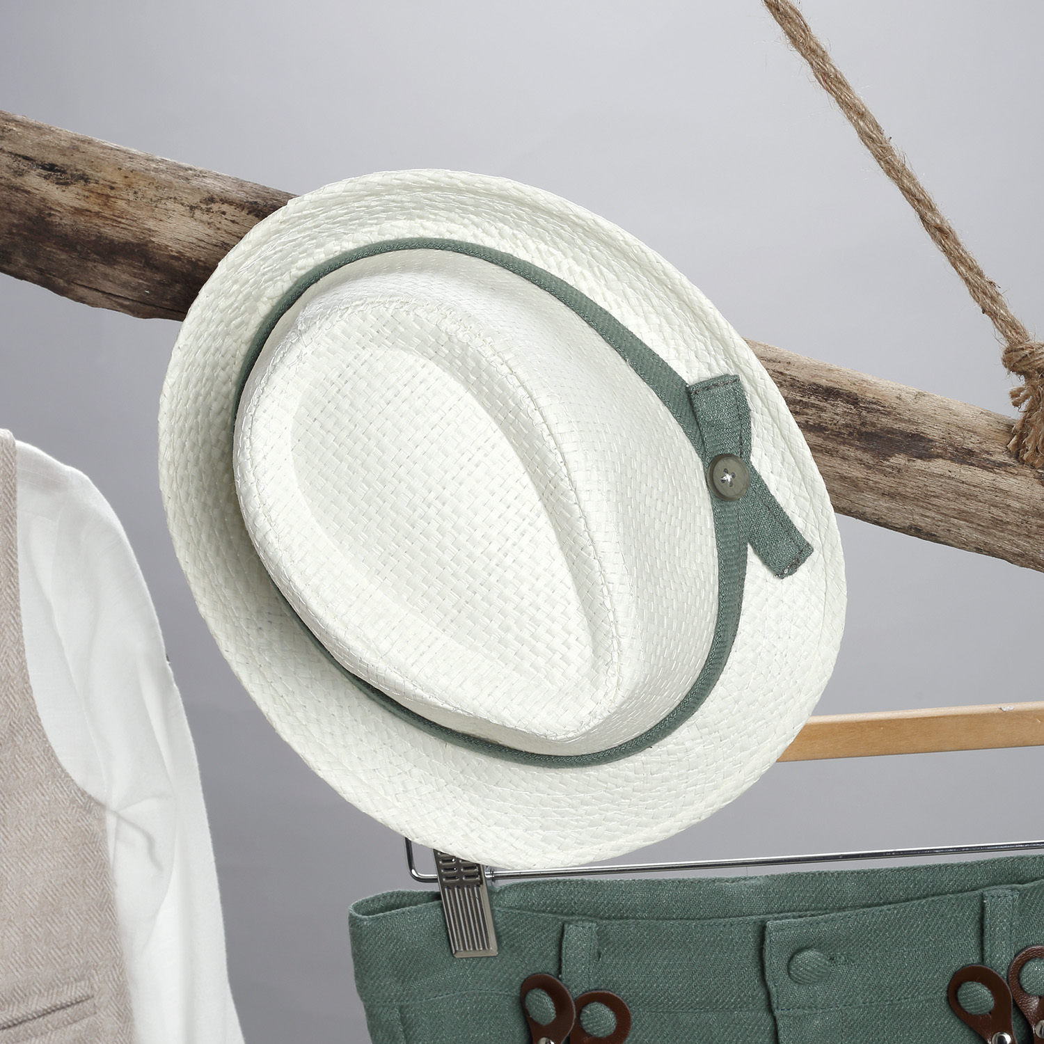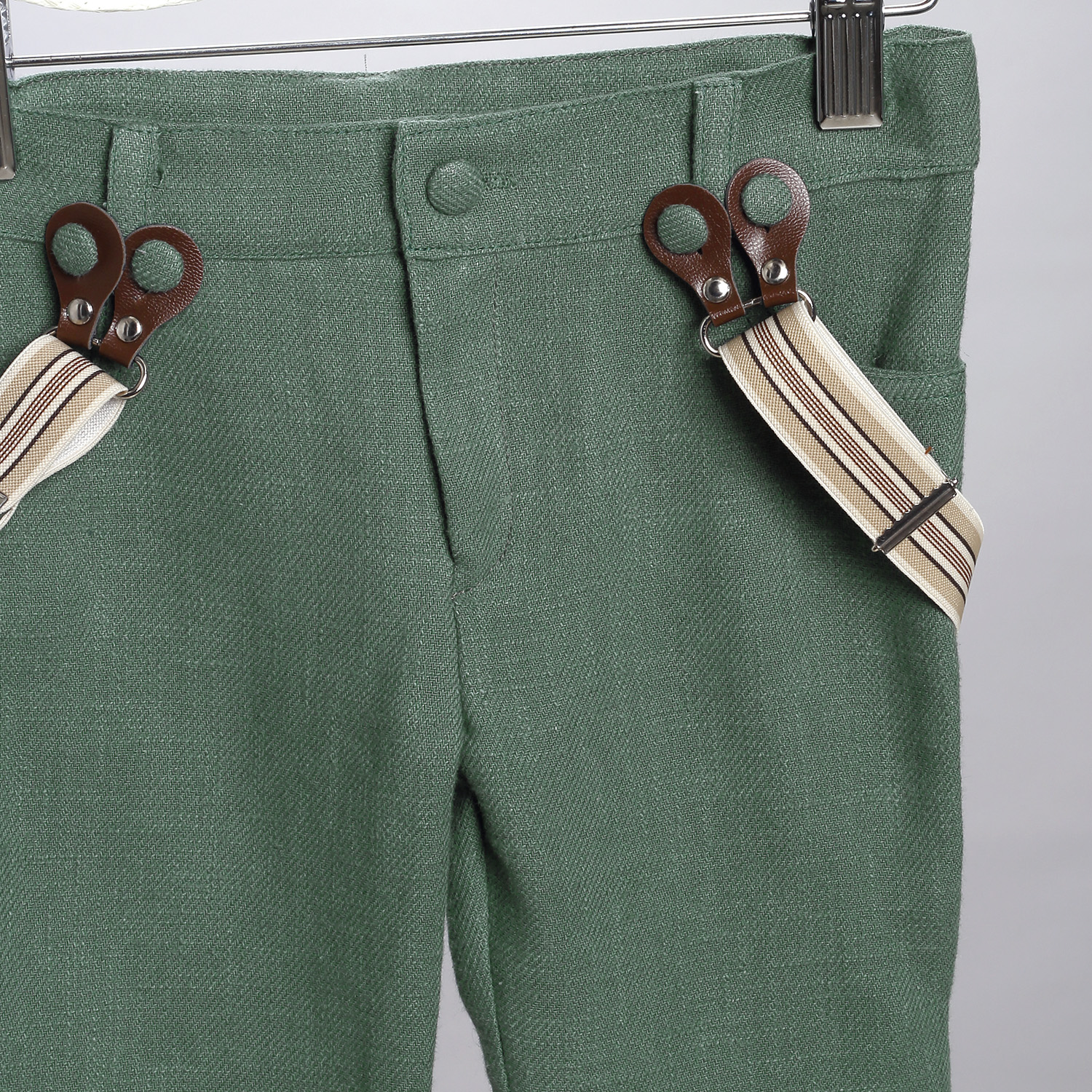 Πράσινο ραμί παντελόνι, εκρού βαμβακερό πουκάμισο και μπεζ καμπαρντίνα γιλέκο.